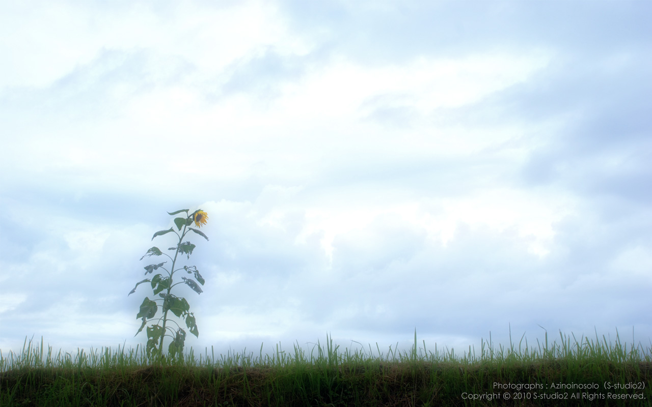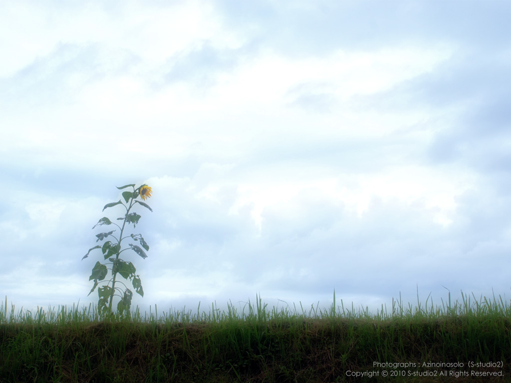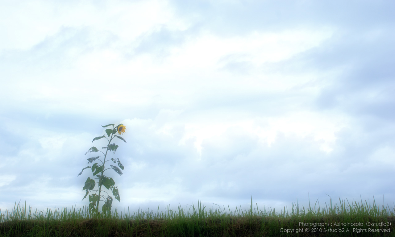 2010年の夏は猛暑。春先に続いた長い雨と寒さからうって変わって、猛烈な暑さとなりました。そんな暑い夏でしたが、初夏のころに雨上がりの風に揺れる、一輪の向日葵(ひまわり)を撮影しました。