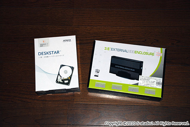 戦利品。左が日立製リテール1TB-HDD。右が何とも知れない中国製USB-HDDケース。