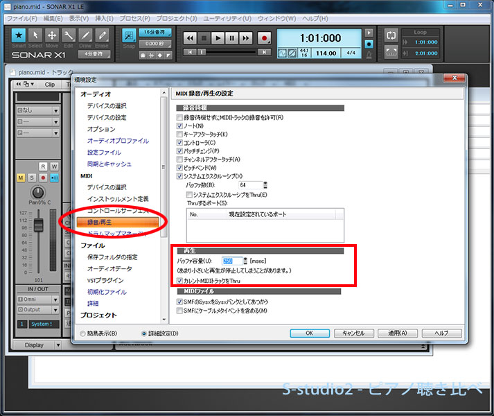 この問題はSONARのMIDIバッファの値を調整することで解決する可能性がありますので、うまく再生できない場合は以下の方法をお試しください。